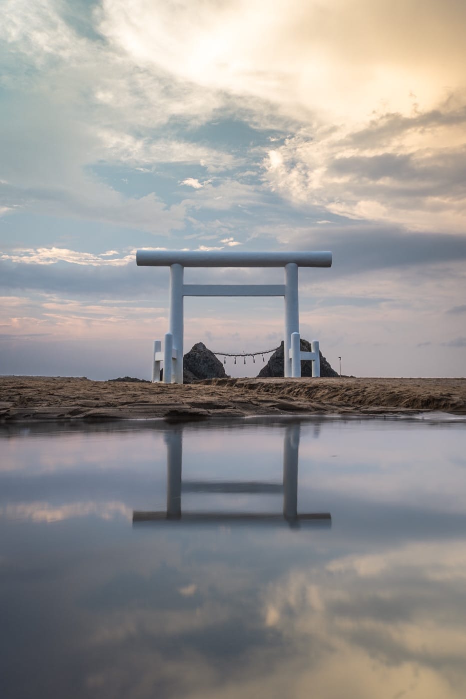 Toward sunset I reached Sakurai-futamigaura (Couple’s Rock). Two stones, standing in the surf, bound by a thick braided shinto rope, symbolizing marriage. I took a deep breath thinking of my bride in South Carolina, and then set up my camera to play with reflections, and see what I could make of the scenery.